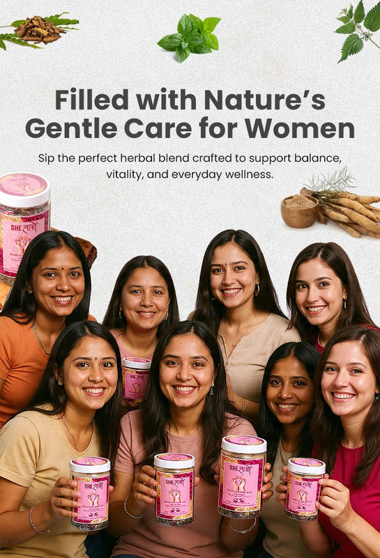 She Shakti Tea is a gentle, herbal blend created to support women through real everyday struggles like irregular cycles, stubborn weight, bloating, acne, and low energy. Each cup delivers hormone-balancing botanicals that help reduce inflammation, improve digestion, and support a healthier metabolism.